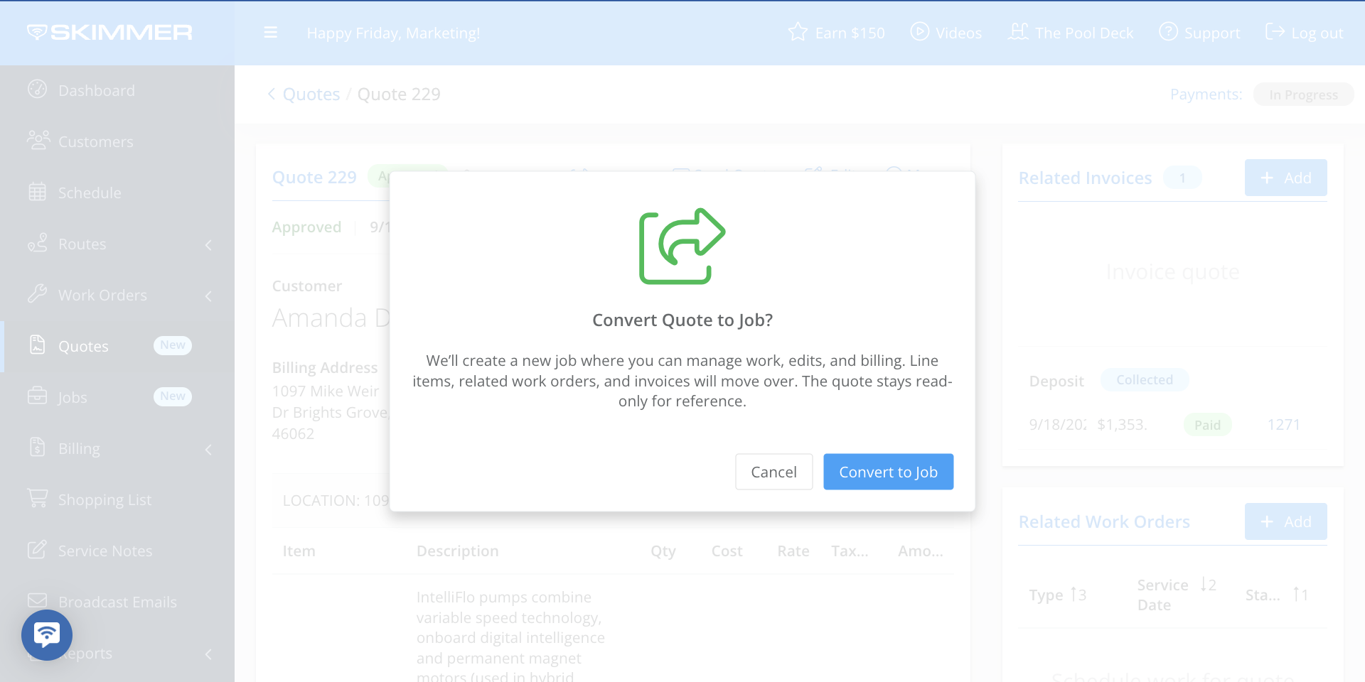 With Skimmer, every approved quote can be instantly converted into a job. Deposits are automatically carried over, line items and fees are preserved, and the handoff from sales to operations is seamless. No double entry. No missed details.