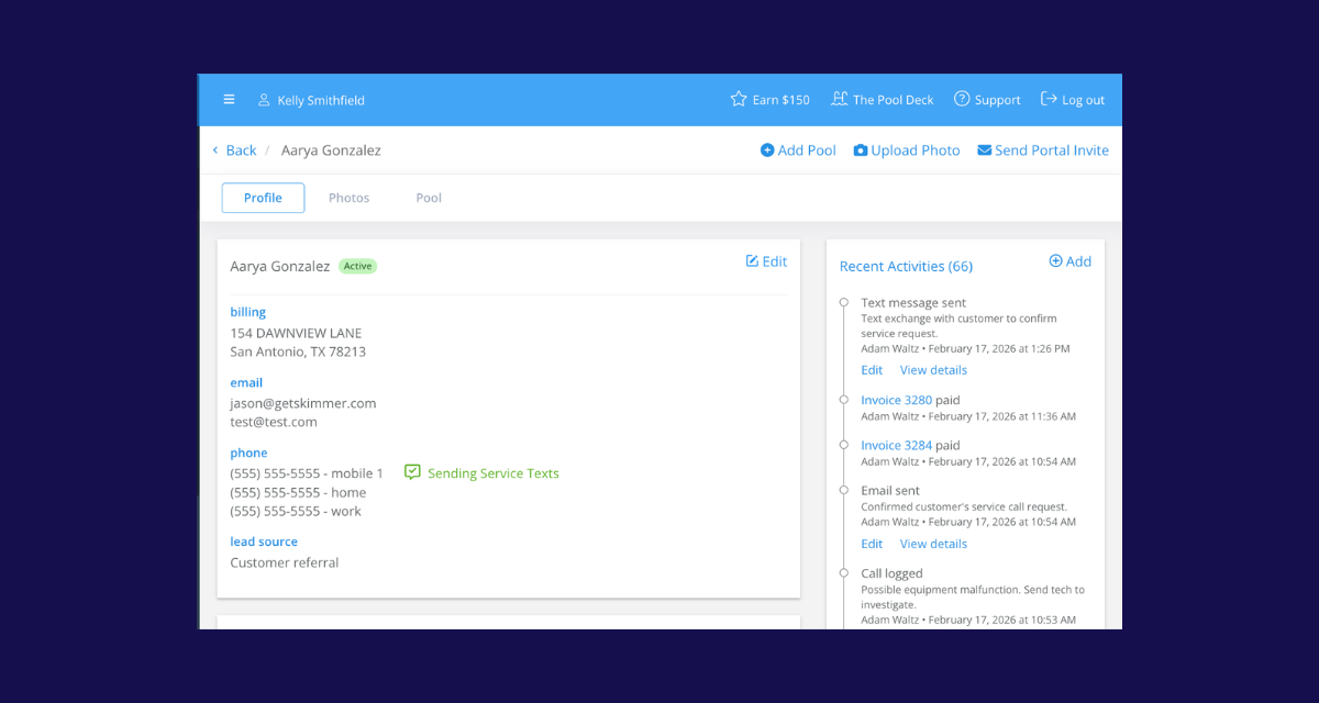 Most pool service businesses have a mix of active customers, past customers, and potential new ones all living in the same contact list with no easy way to tell them apart. The new CRM enhancements bring more structure to that. You can now segment customers by status, Lead, Active, or Inactive, and track lead sources to understand which channels are actually bringing in new business. A new customer activity feed on each customer's detail page pulls together quotes, payments, work orders, jobs, service notes, and more into a single chronological timeline, making it easier to understand a customer relationship at a glance.