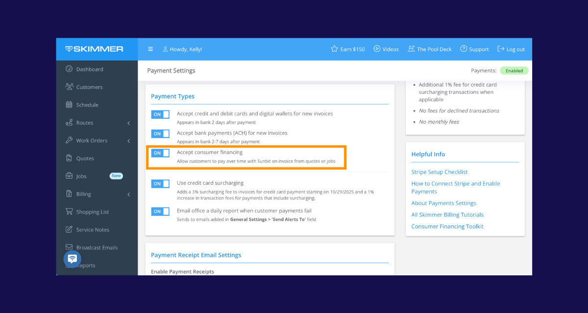 Pros now have a new way to offer flexible payment options to customers. Financing helps reduce friction at checkout and makes it easier for customers to move forward on larger jobs, while keeping payments and billing managed directly within Skimmer.