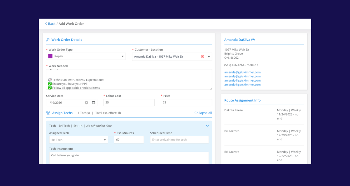 For teams using integrations or custom tools, the Public API now supports searching customers by phone number or email and creating work orders programmatically. These additions make it easier to build reliable workflows outside of Skimmer while keeping data accurate and up to date.
