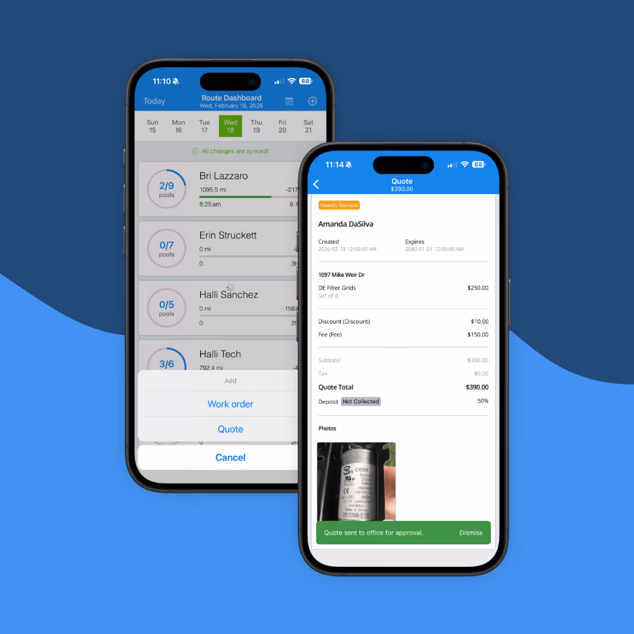 Techs can adjust stops on the go to see the best route via Skimmer’s mobile app. This gives them more job confidence, cuts drive time and helps them visit more stops in a day. Plus, the app works offline, making it easy to work in low-service areas. Simply sync when you’re back online!